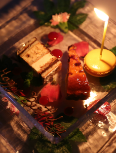 お誕生日や結婚記念日のお祝いにガラスのお皿にお花をあしらった「オリジナル・メッセージプレート」をご用意いたしております。特別な日のサプライズ演出としてとてもお喜びいただいております。Happy Birthday, Wedding Anniversary , Congratulation などのほかに、「おつかれさまでした」、「祝・米寿」など簡単な日本語もお選びいただけます。(コース料理でご予約のお客様には無料で提供しております。)