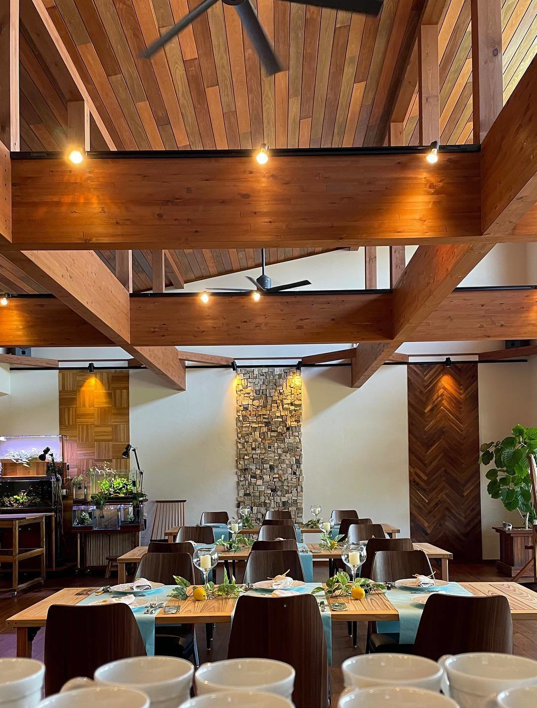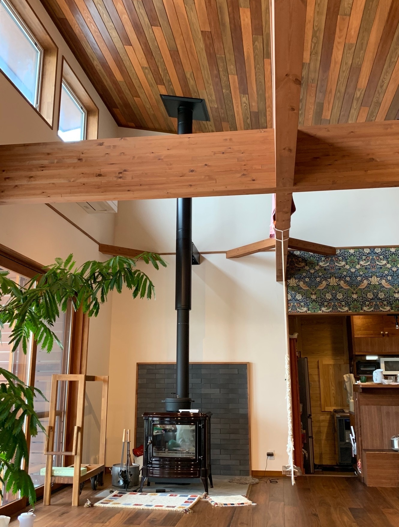 天高5メートルの開放的なダイニングの中に、ロートアイアン製らせん階段、ネスターマーティン社製の薪ストーブ、マダガスカル・ウッドストーンのアクセントウォール、ウイリアム・モリスのR壁などが点在するおしゃれ空間が広がります。お客様自身のアイデアで自由にお楽しみください。